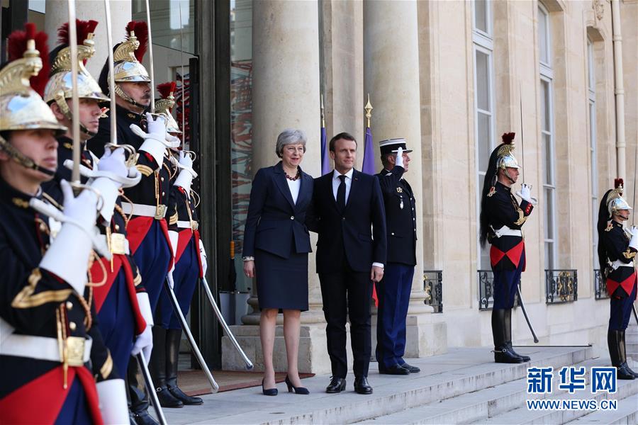 4月9日,在法国巴黎总统府爱丽舍宫,法国总统马克龙(中右)迎接到访的英国首相特雷莎·梅。 新华社记者高静摄