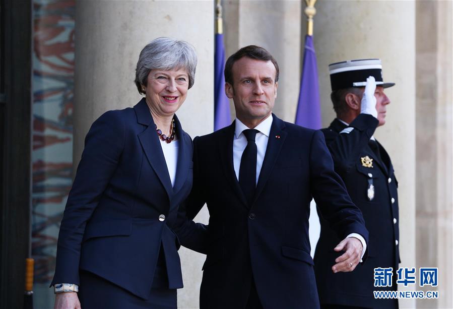4月9日,在法国巴黎总统府爱丽舍宫,法国总统马克龙(前排右)迎接到访的英国首相特雷莎·梅。 新华社记者高静摄