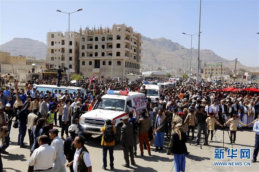 4月10日,在也门萨那,人们参加遇难者的葬礼。 7日,也门首都萨那东部一所学校附近发生爆炸,造成14名学生死亡。也门胡塞武装指责沙特领导的多国联军对学校所在地进行空袭,造成了这一灾难。 新华社发(穆罕默德摄)