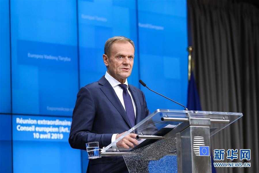 4月11日,在比利时布鲁塞尔,欧洲理事会主席图斯克出席新闻发布会。新华社记者张铖摄