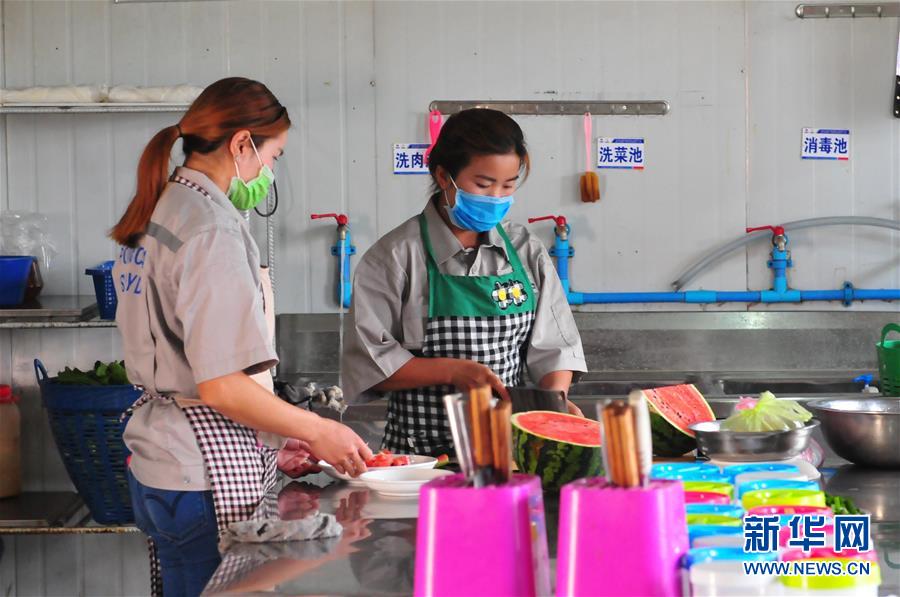 杨坎·西玛拉(右)在老挝噶西县的中老铁路四标段项目部帮厨(2月18日摄)。新华社记者章建华摄
