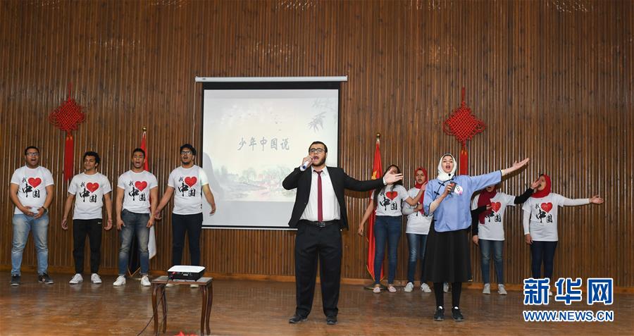 4月10日,在埃及伊斯梅利亚,选手在第二届郭沫若杯中国现代诗歌朗诵比赛上表演。新华社记者 邬惠我 摄