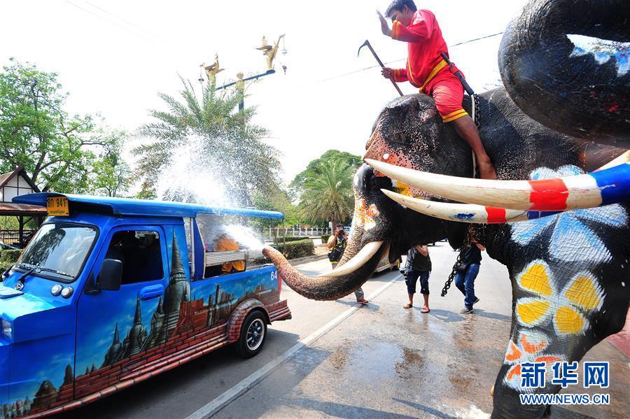 4月11日,在泰国大城府举行的庆祝活动上,大象向车上的游客喷水。 当日,泰国古都大城府举行庆祝活动,迎接即将到来的泰历新年“宋干节”。 新华社发(拉亨摄)