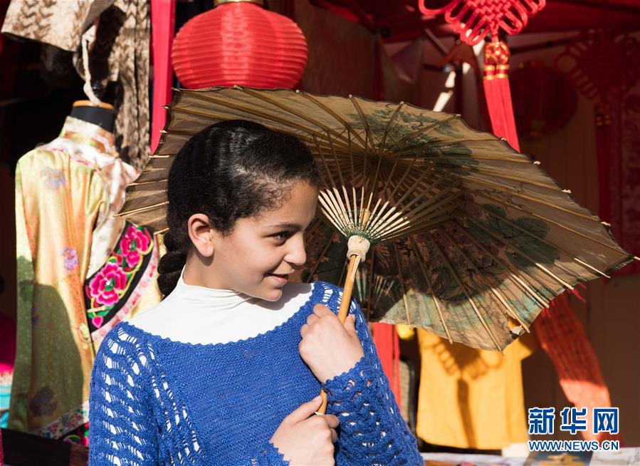 4月11日,在埃及首都开罗,一名女孩举着伞站在中国展区旁。 埃及第四届“法老村”国际文化节11日在首都开罗的“法老村”旅游风景区举行,吸引来自中国、韩国、泰国、巴基斯坦、也门等18个国家的驻埃使馆和文化机构参与,共同举办文化展示活动。 新华社记者邬惠我摄