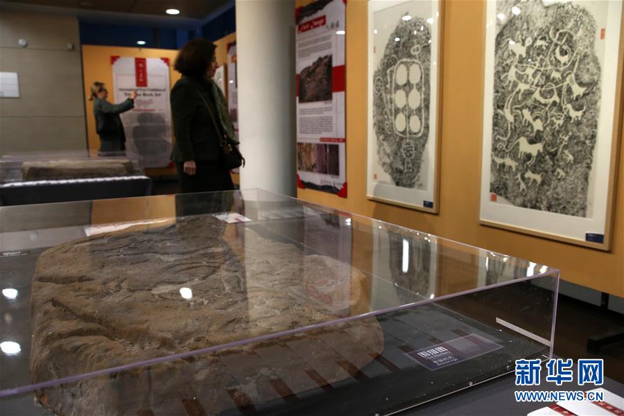 4月11日,在希腊雅典,当地民众在观赏展出作品。 由中国国家艺术基金、沈阳师范大学和中国驻希腊大使馆联合举办的“中国岩刻丝路行——阴山岩刻艺术国际巡展”11日晚在雅典开幕。 新华社发(马里奥斯·罗洛斯摄)