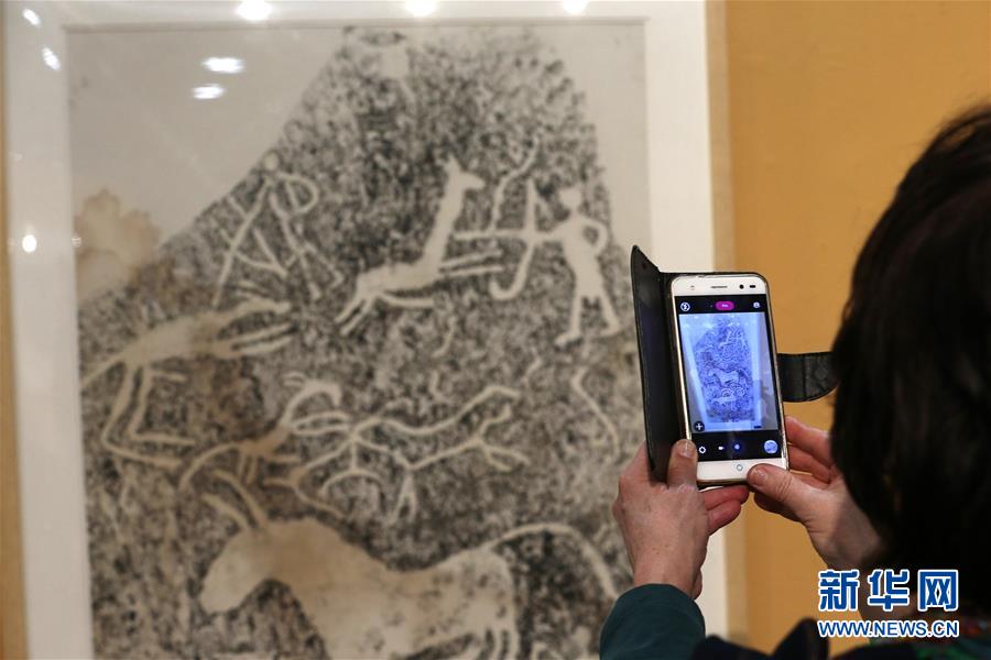 4月11日,在希腊雅典,观众在拍摄展出作品。 由中国国家艺术基金、沈阳师范大学和中国驻希腊大使馆联合举办的“中国岩刻丝路行——阴山岩刻艺术国际巡展”11日晚在雅典开幕。 新华社发(马里奥斯·罗洛斯摄)