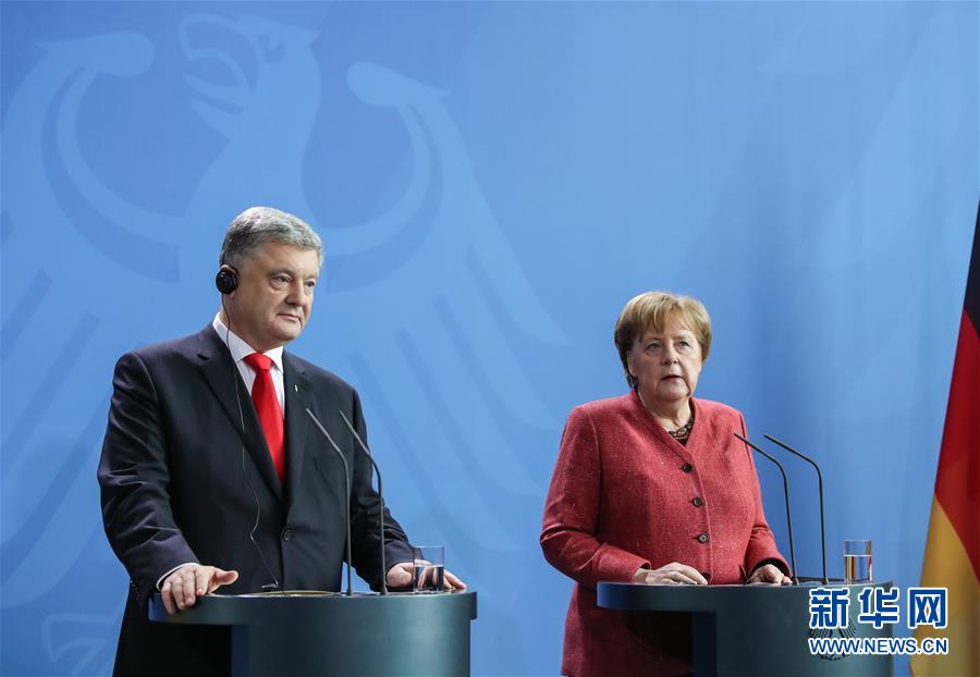 4月12日,在德国首都柏林的总理府,德国总理默克尔(右)与来访的乌克兰总统波罗申科出席新闻发布会。 新华社记者 单宇琦 摄