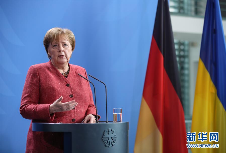 4月12日,在德国首都柏林的总理府,德国总理默克尔与来访的乌克兰总统波罗申科(不在画面中)出席新闻发布会。 新华社记者 单宇琦 摄