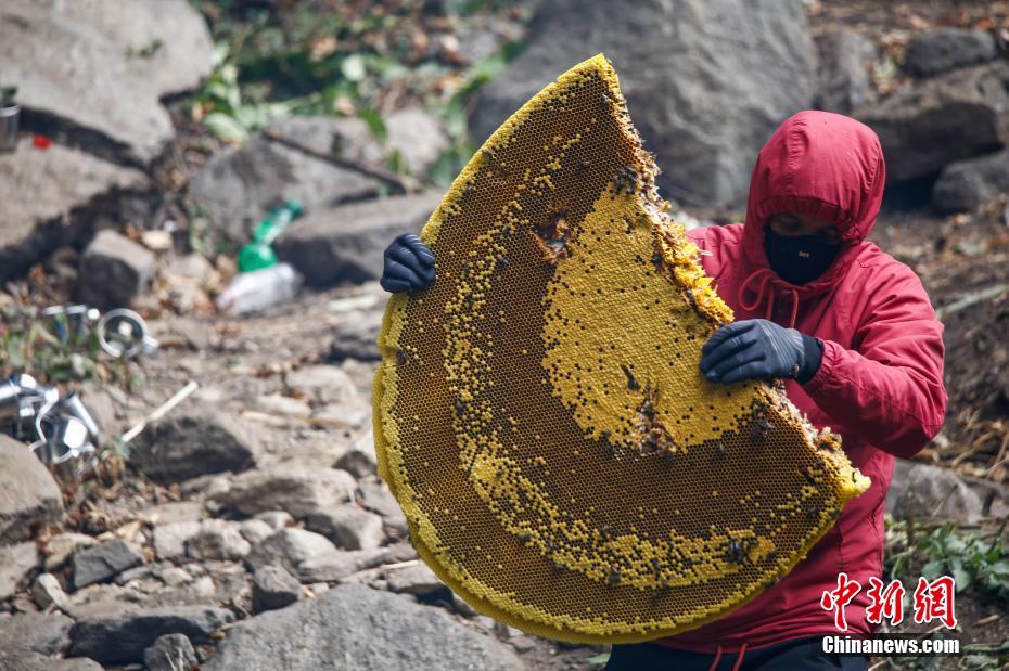 4月中旬,尼泊尔卡斯基地区一名采蜜人获得了一个较为规整的蜂巢。尼泊尔山区的蜂蜜品质较好,其中的“岩蜜”因为蜂巢在岩石边而获名。这也为岩蜜采集活动增添了风险性。中新社发 普拉丹 摄