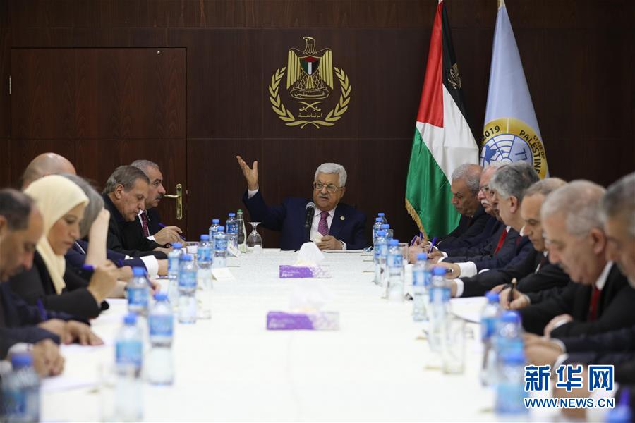 4月13日,在约旦河西岸城市拉姆安拉巴勒斯坦总统府,巴勒斯坦总统阿巴斯(中)会见新一届巴勒斯坦政府成员。新华社发(法迪·阿鲁里摄)