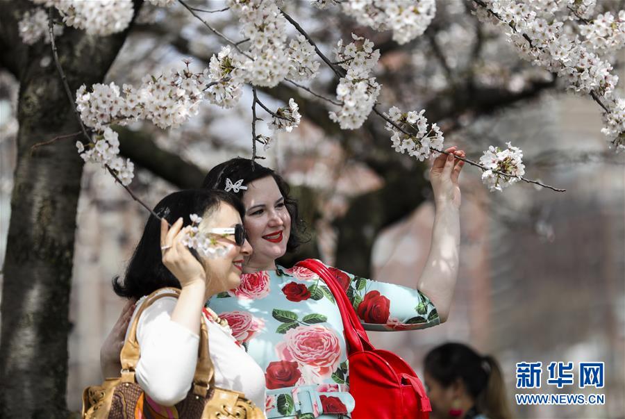 4月13日,在美国纽约罗斯福岛,游人在樱花树下拍照。当日,纽约罗斯福岛举行樱花节,吸引众多游人前来踏春赏樱。 新华社记者邹广萍摄