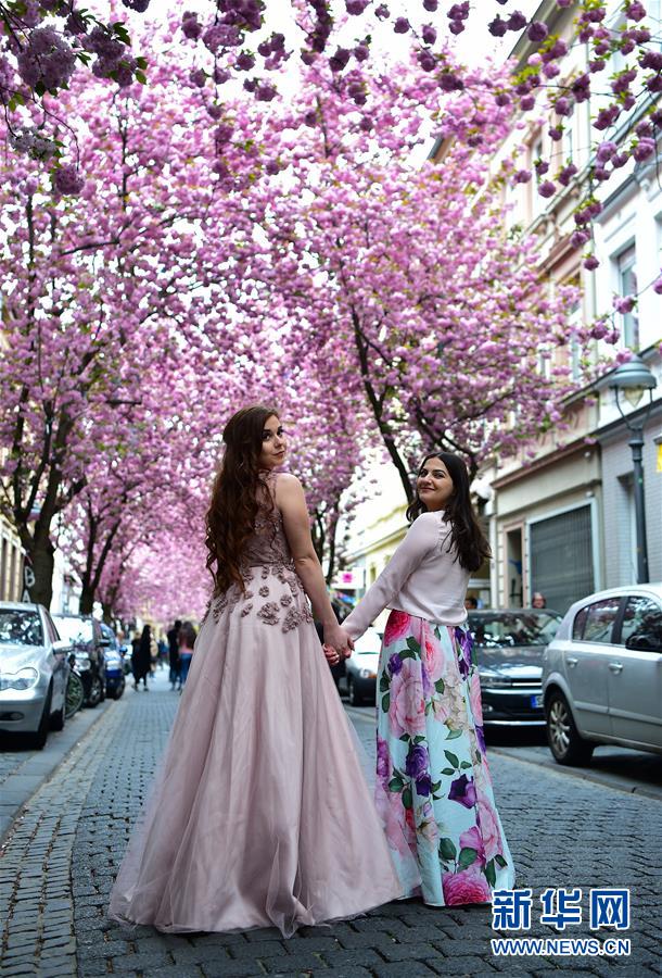 4月12日,在德国波恩市,人们在盛开的樱花前拍照。新华社记者逯阳摄