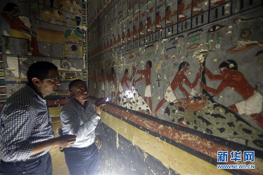 4月13日,在埃及首都开罗以南约30公里的塞加拉地区,人们在贵族墓葬内参观。13日,埃及文物部组织媒体参观了近日在首都开罗以南约30公里的塞加拉地区发现的一座第五王朝时期的贵族墓葬。埃及文物部发布的声明说,该金字塔位于杰德卡雷金字塔旁,是迄今为止发现的古王国时期最大的王后金字塔。 新华社发(艾哈迈德·戈马摄)