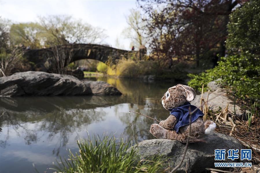 4月13日,在美国纽约中央公园,一只玩偶“坐”在池塘边。当日天气回暖,纽约中央公园春意盎然,吸引了众多游人前来赏花踏青。 新华社记者 王迎 摄