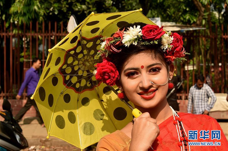 4月14日,一名女子身着盛装参加节日游行活动。 当日,孟加拉国迎来孟历新年,首都达卡举行节日游行。 新华社发(萨利姆·礼萨 摄)