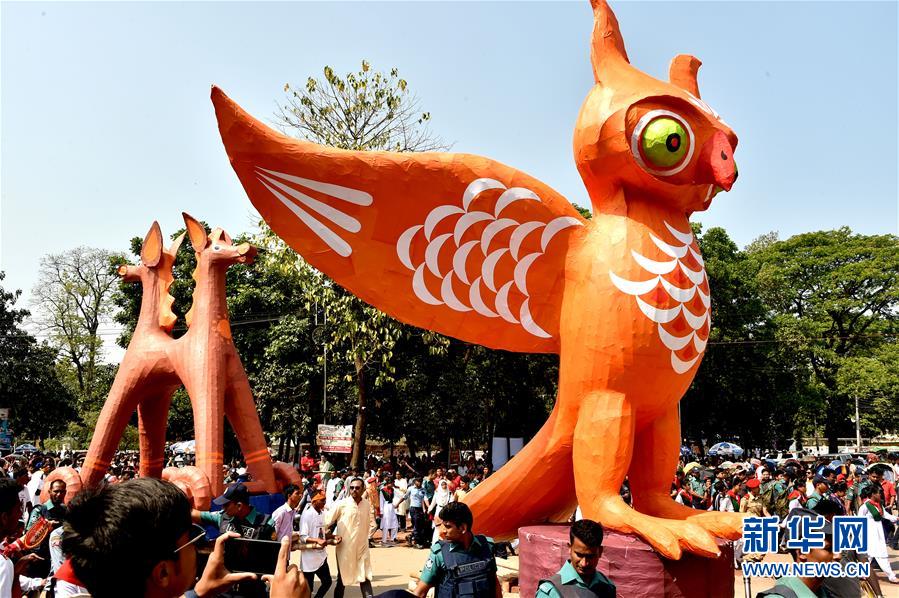 4月14日,民众推着彩车参加孟历新年游行活动。 当日,孟加拉国迎来孟历新年,首都达卡举行节日游行。 新华社发(萨利姆·礼萨 摄)