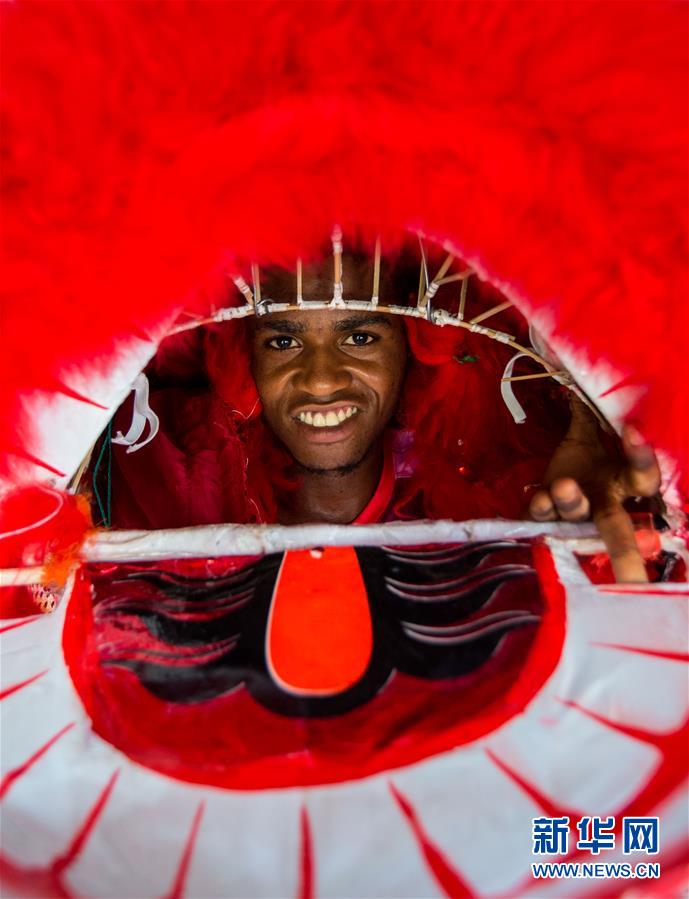 这是3月14日在尼日利亚拉各斯的泉高学校拍摄的一名当地舞狮演员。 新华社记者 吕帅 摄