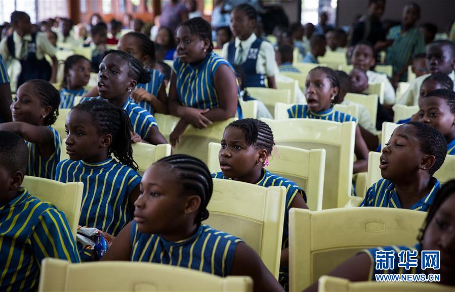 3月14日,在尼日利亚拉各斯的泉高学校,小观众们观看华星艺术团的表演。新华社记者 吕帅 摄