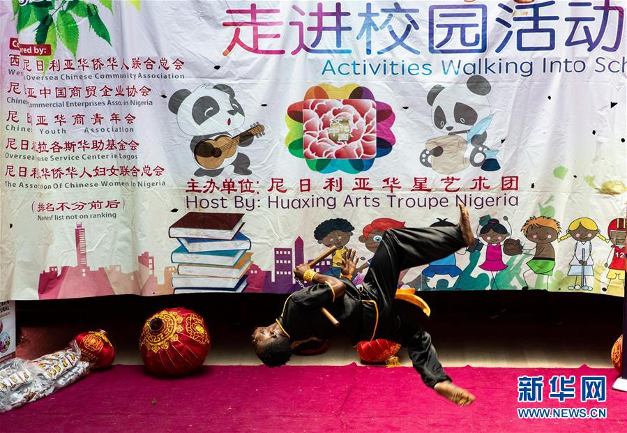 3月14日,在尼日利亚拉各斯的迪士布里学校,一名当地演员表演双节棍。 新华社记者 吕帅 摄