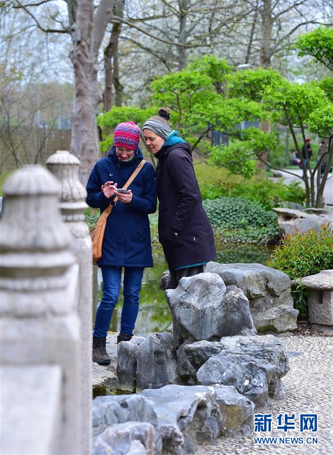 4月13日,在德国曼海姆,游客在“多景园”游玩。新华社记者逯阳摄