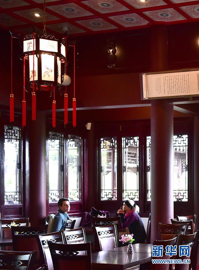4月13日,在德国曼海姆,游客在“多景园”内的“多景楼”饮茶休憩。 新华社记者逯阳摄