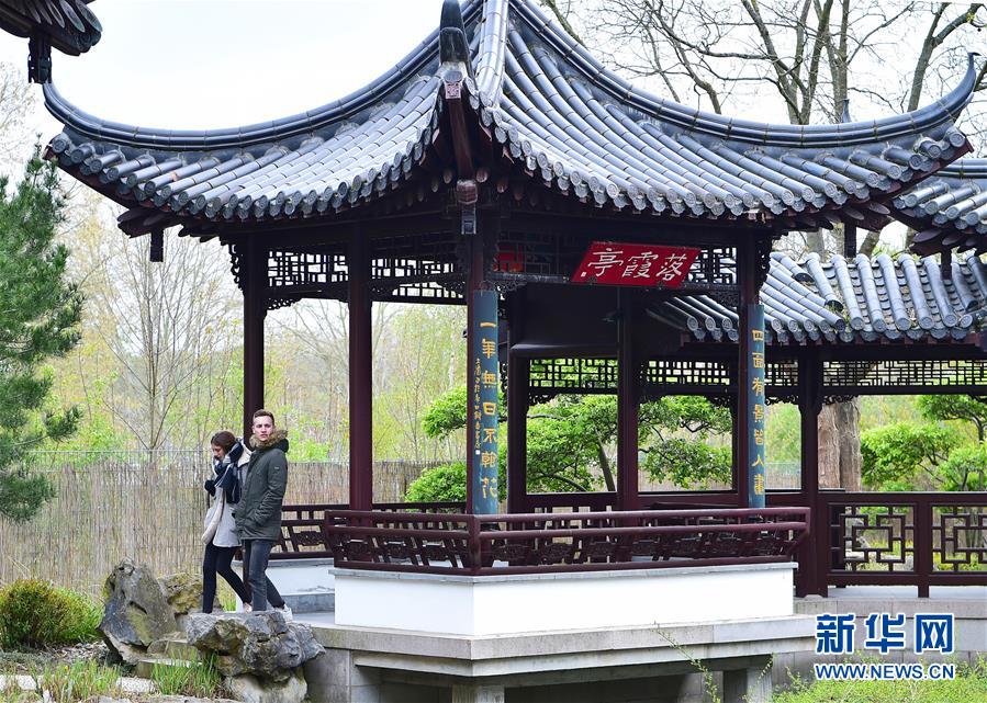 4月13日,在德国曼海姆,游客从“多景园”内的“落霞亭”旁经过。 新华社记者逯阳摄