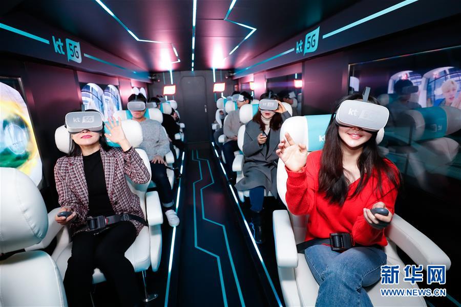 1月16日,体验者们在韩国首尔光化门附近的5G巴士上感受高速VR视听产品。