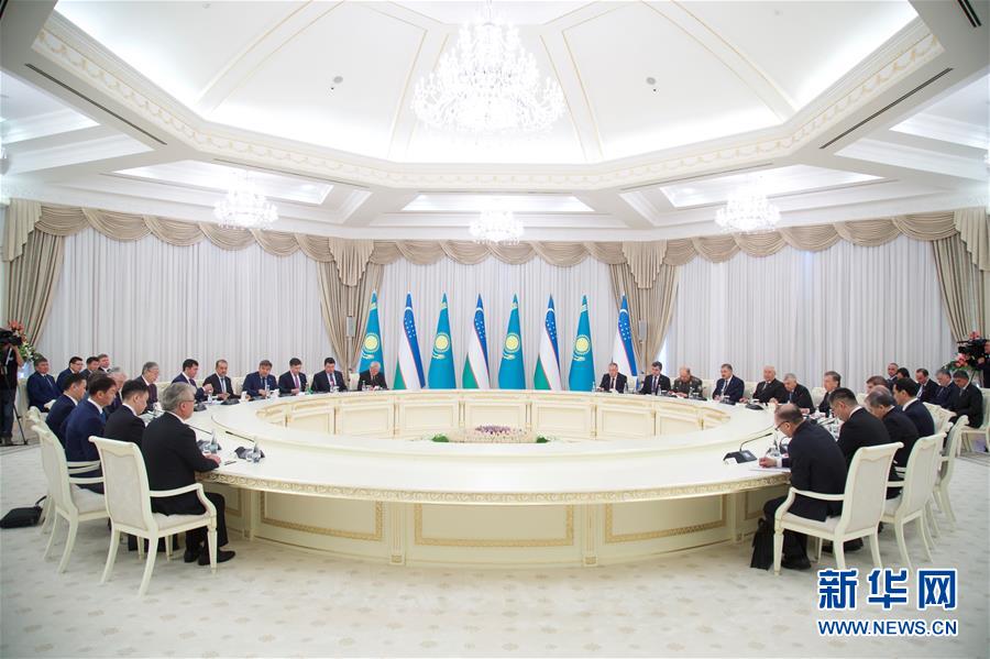4月15日,在乌兹别克斯坦首都塔什干,乌兹别克斯坦和哈萨克斯坦双方举行会谈。新华社记者蔡国栋摄
