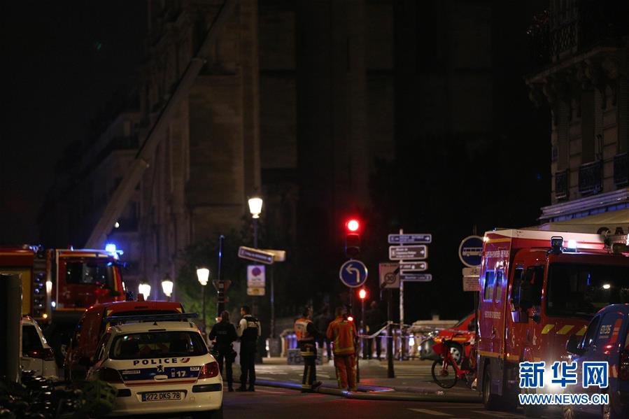 4月15日,在法国巴黎,警车和消防车停靠在巴黎圣母院旁。新华社记者 高静 摄