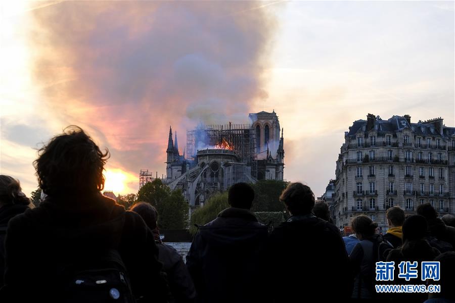 4月15日,在法国巴黎,人们围观着火的巴黎圣母院。 新华社发(亚历山大·卡曼摄)