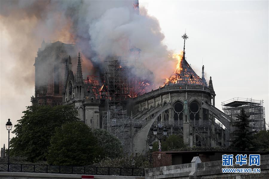 4月15日,在法国巴黎,巴黎圣母院燃起大火。 新华社发(亚历山大·卡曼摄)