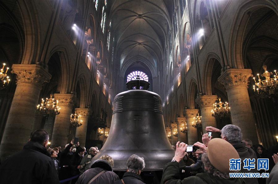 这是2013年2月15日,在法国巴黎,人们参观为迎接巴黎圣母院850岁生日建造的新铜钟。巴黎圣母院于2013年3月23日迎来850岁生日。 新华社记者高静摄