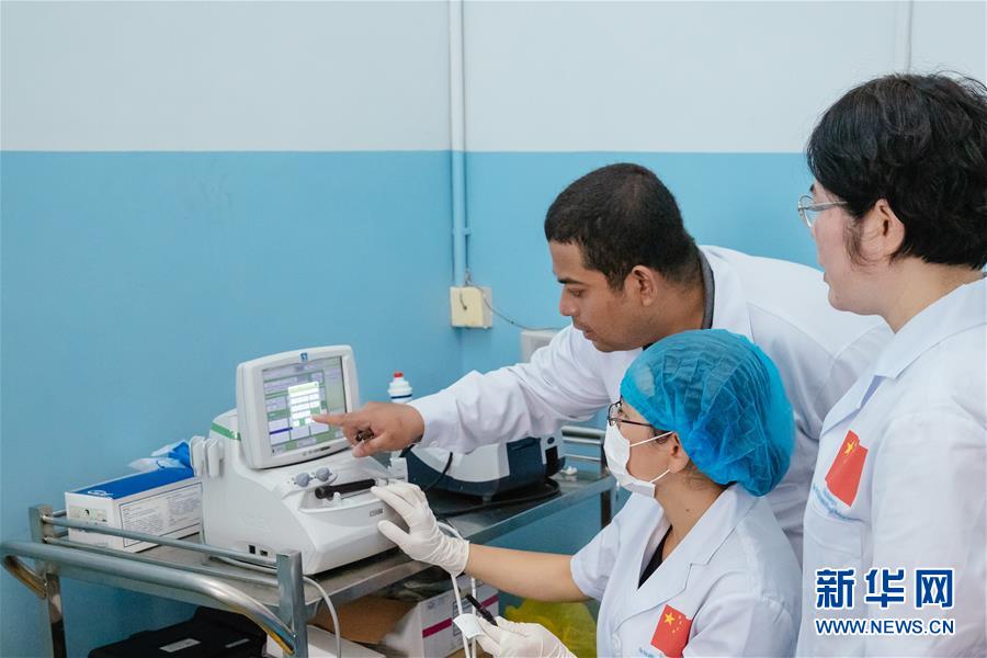 3月15日,在柬埔寨磅湛省医院,洪清(后)与中国医疗队队员查看仪器数值。 新华社记者朱炜摄