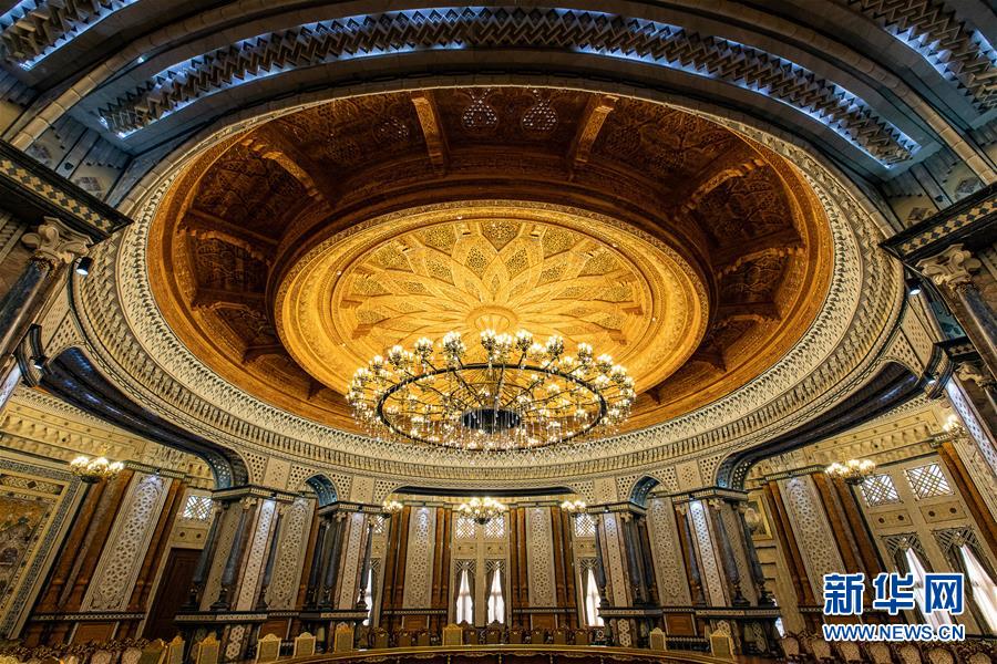 这是4月14日在塔吉克斯坦首都杜尚别拍摄的纳乌鲁兹宫阿尔章会议厅。纳乌鲁兹宫坐落在塔吉克斯坦首都杜尚别市中心青年湖畔,灰白色的墙体上雕花繁复,廊柱雄伟。这一具有鲜明民族特色的三层文化娱乐综合设施于2014年投入使用,是上海合作组织成员国元首理事会第十四次会议的主会场。新华社记者 白雪骐 摄