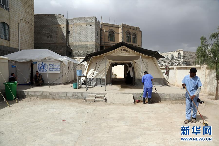 4月15日,在也门萨那一家医院,工作人员在治疗霍乱患者的帐篷外打扫卫生。 联合国负责人道主义事务的副秘书长洛科克说,近来也门霍乱、白喉、麻疹病例激增,约200万学龄儿童仍然失学。 新华社发(穆罕默德摄)