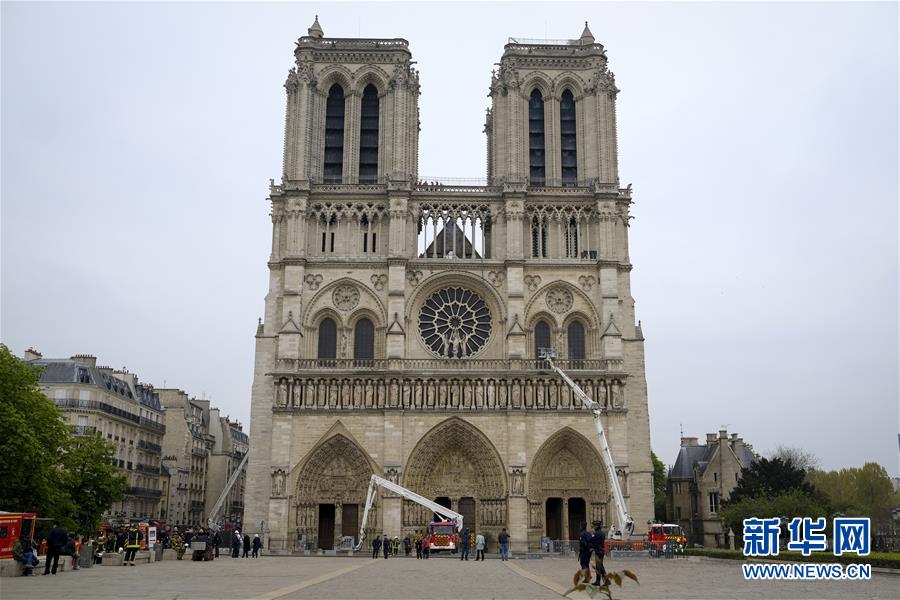 4月16日,在法国巴黎,消防人员在巴黎圣母院工作。 法国消防部门16日上表示,当天上午10点巴黎圣母院的火情已经全部扑灭,目前进入对火灾调查和损失评估阶段。 新华社发(亚历山大·卡曼摄)