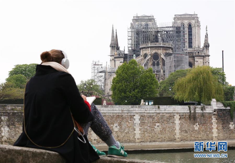 4月16日,在法国巴黎,一名女子在塞纳河畔为“受伤”的巴黎圣母院写生。新华社记者 高静 摄