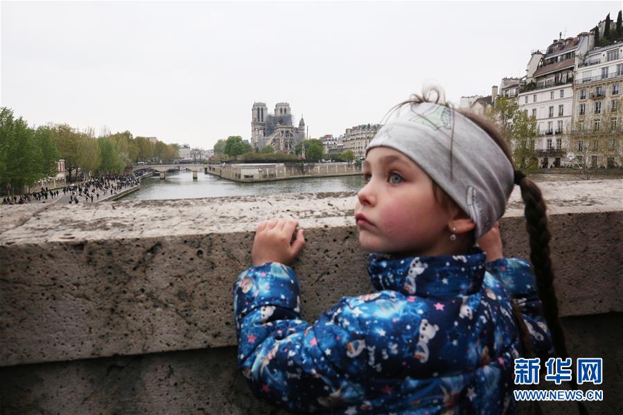 4月16日,在法国巴黎,一名小女孩在桥上看望“受伤”的巴黎圣母院。新华社记者 高静 摄