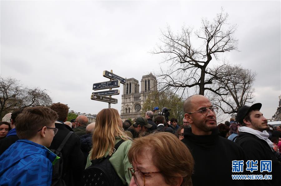 4月16日,在法国巴黎,人们聚集在“受伤”的巴黎圣母院附近。 新华社记者 高静 摄