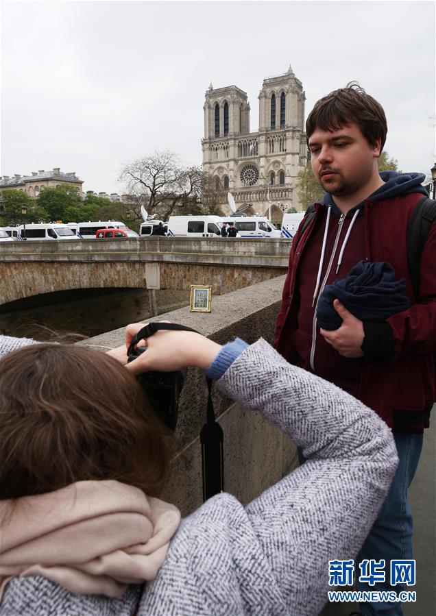 4月16日,在法国巴黎,一对情侣为巴黎圣母院和它的小画像拍合影。新华社记者 高静 摄