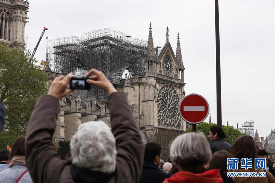 4月16日,在法国巴黎,人们聚集在“受伤”的巴黎圣母院附近。新华社记者 高静 摄
