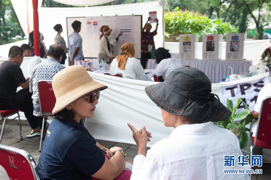 4月17日,在印尼雅加达一处投票站外,选民正在关注快速计票环节。