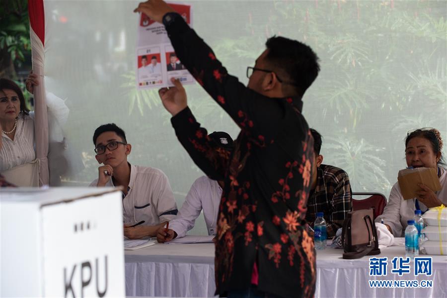 4月17日,在印尼雅加达一处投票站,印尼选举委员会的工作人员开始统计选票。