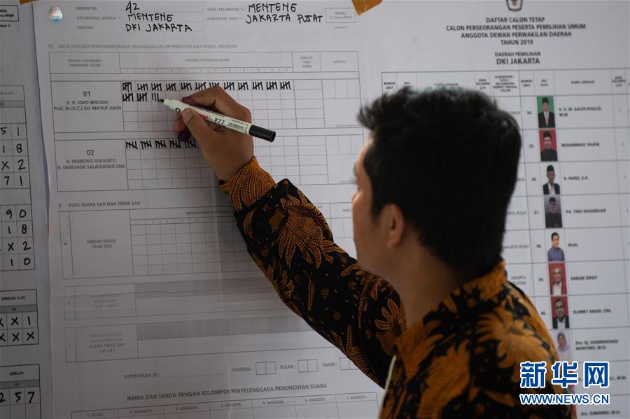 4月17日,在印尼雅加达一处投票站,印尼选举委员会的工作人员开始统计选票。