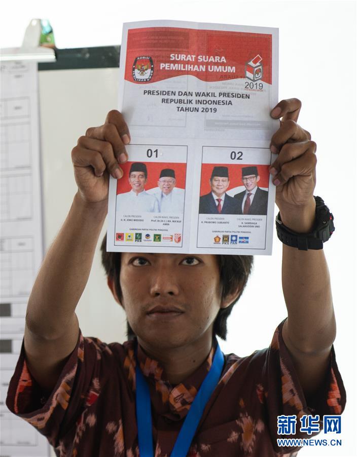 4月17日,在印尼雅加达一处投票站,印尼选举委员会的工作人员开始统计选票。