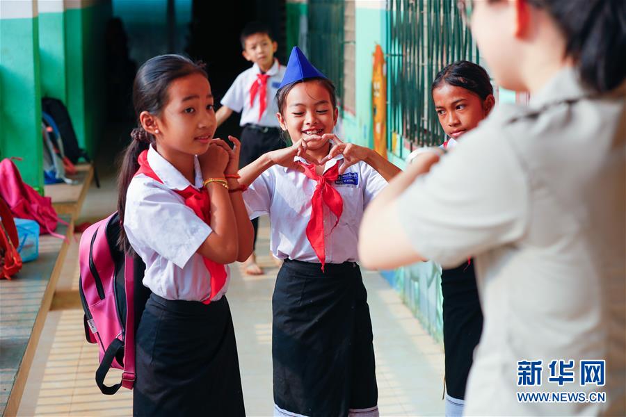 3月25日,在老挝万象中老农冰村小学,姚昌华教学生如何用手比出爱心。 新华社记者王婧嫱摄
