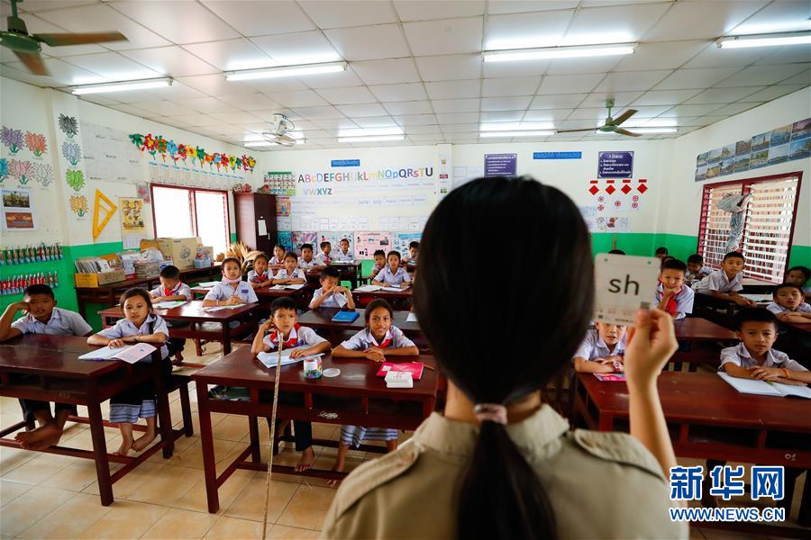 3月26日,在老挝万象中老农冰村小学,林婕妤给三年级的学生上汉语课。新华社记者王婧嫱摄