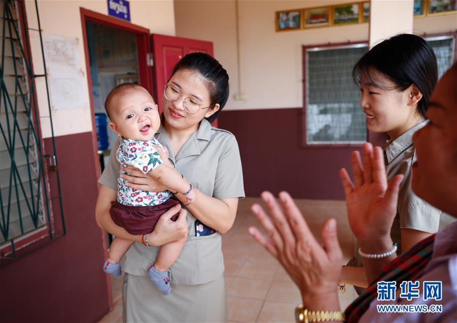 3月26日,在老挝万象中老农冰村小学,姚昌华(左)和林婕妤在午饭后逗同事的孩子玩。新华社记者王婧嫱摄