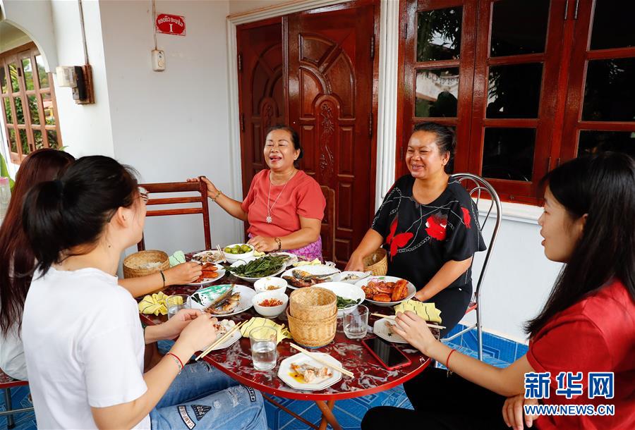 3月24日,在老挝万象,林婕妤(右一)和姚昌华(左一)在校长奔米(右三)家中和她的家人吃早餐。新华社记者王婧嫱摄