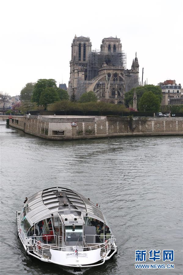 4月16日,在法国巴黎,一艘游船经过火灾后的巴黎圣母院。新华社记者高静摄